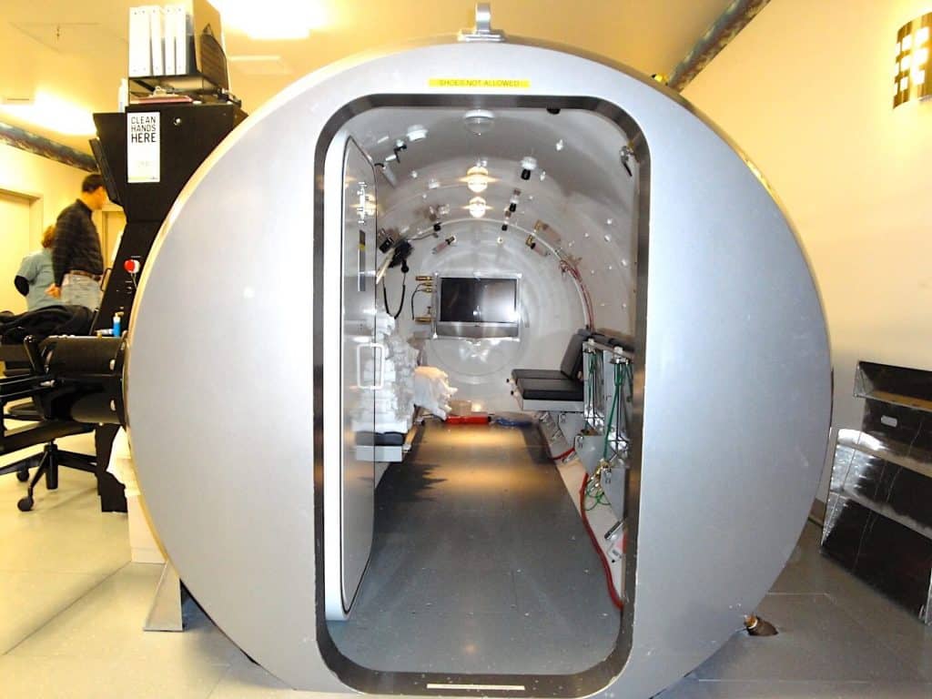 The treatment is generally painless. Before going into the chamber, the patient puts on a hospital gown. Once they are lying comfortably on a stretcher, it will be slid into the chamber. After the door closes, the gentle “hiss” of the incoming oxygen used to pressurize the chamber will be heard.